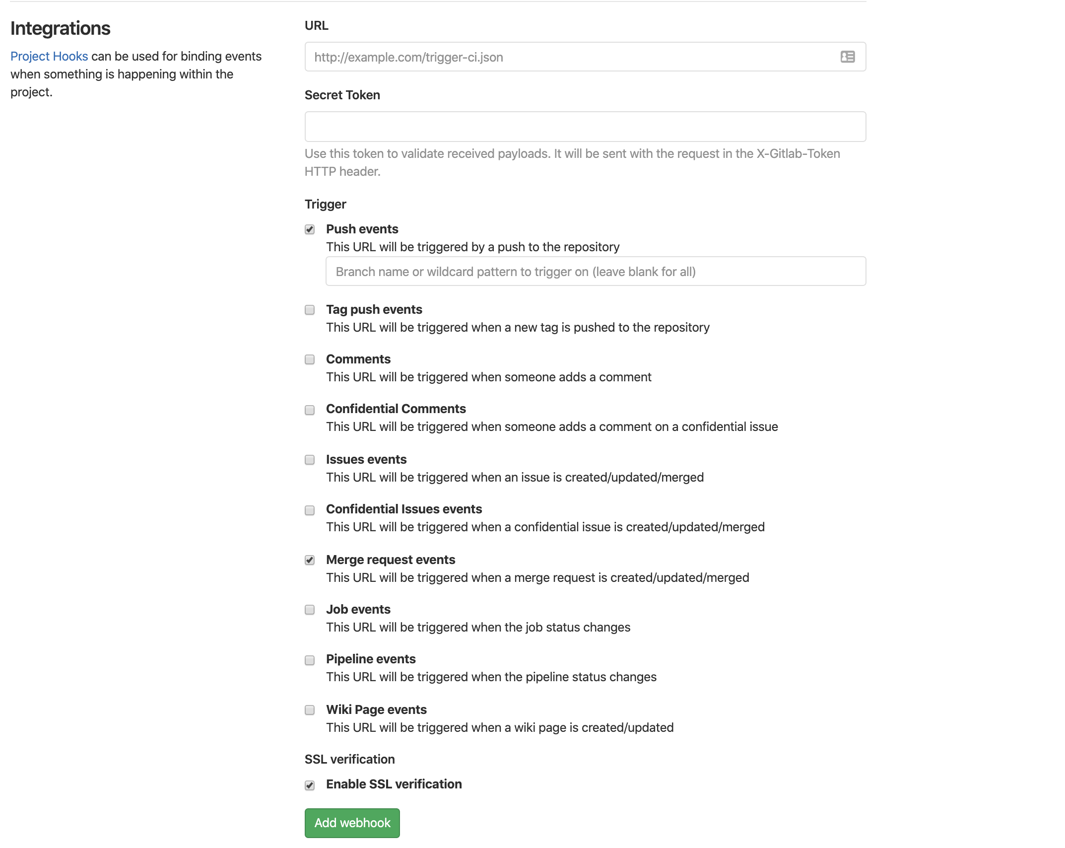 Triggerevents which will send a notification to Lagoon. We suggest that you sendPush eventsandMerge request events, and then filter further in the Lagoon configuration of your project.